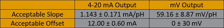 Use the following information to determine if the electrode is in acceptable range (These are pHionics guidelines based on calibration at 25°C and may not be the same for other manufacturers):